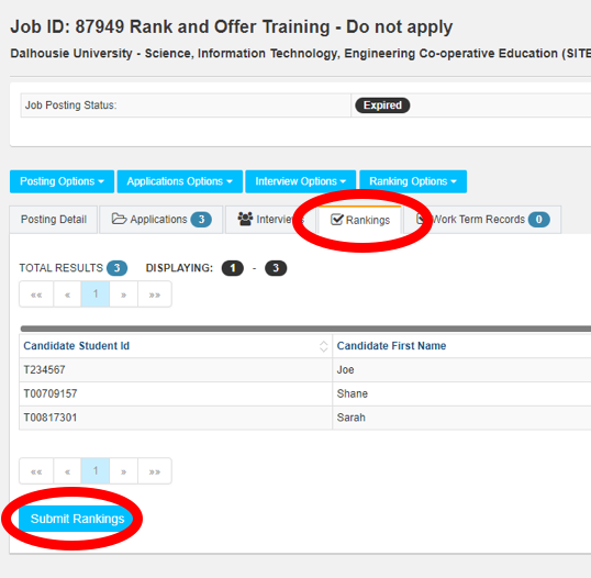1. Within the Work-Integrated Learning & Co-operative Eduction Overview menu on the left, scroll to the bottom of the page and click the button called, 'View Work-Integrated Learning & Co-operative Education Ranking.' Once clicked you will see the jobs you have posted that are eligible for Rank & Offer